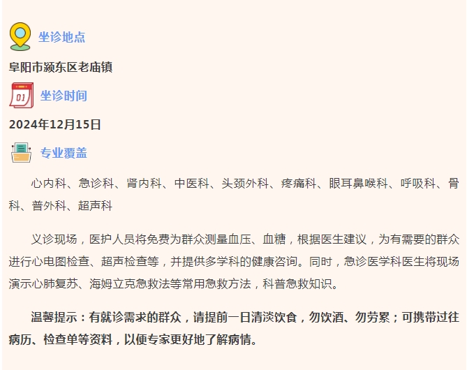 12月15日,阜阳市肿瘤医院专家团将在颍东老庙镇开展公益义诊活动