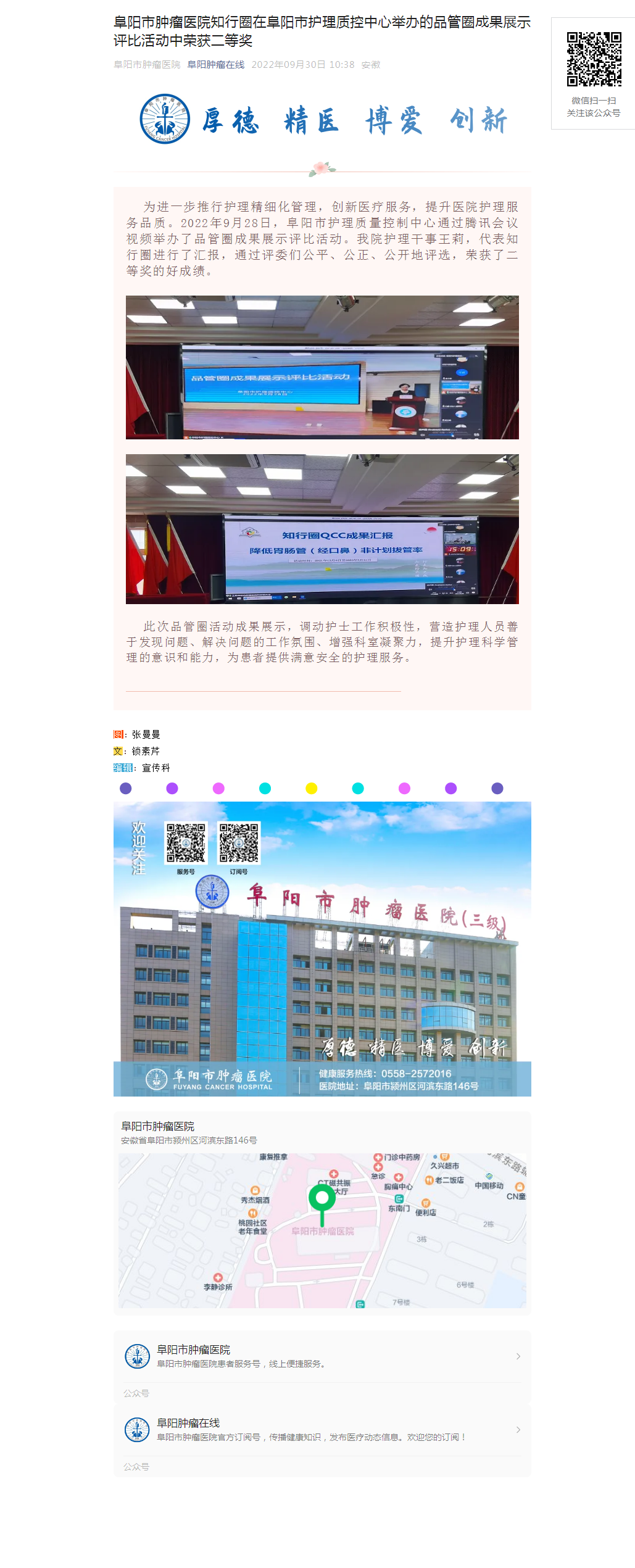 阜阳市肿瘤医院知行圈在阜阳市护理质控中心举办的品管圈成果展示评比活动中荣获二等奖
