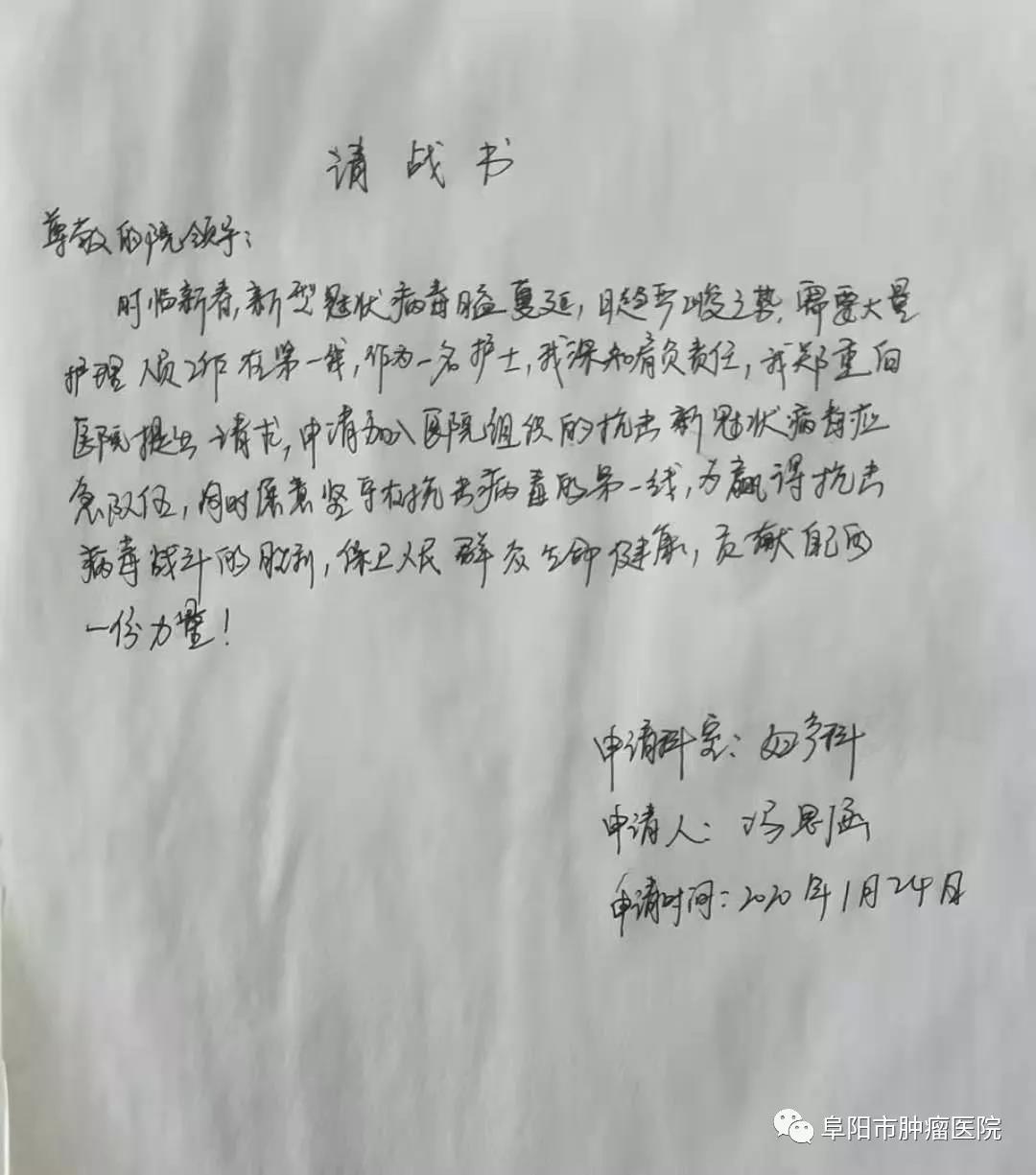 一张张请战书,一句句斩钉截铁的话语,体现出肿瘤医院全院上下对抗击疫情的意志与信念,在这个战场上,我院全体员工用高昂的士气、坚定的决心、必胜的信心展现出医务人员高尚的品格与精神。
