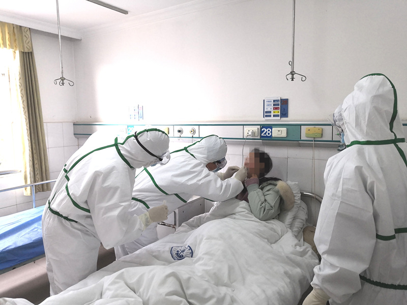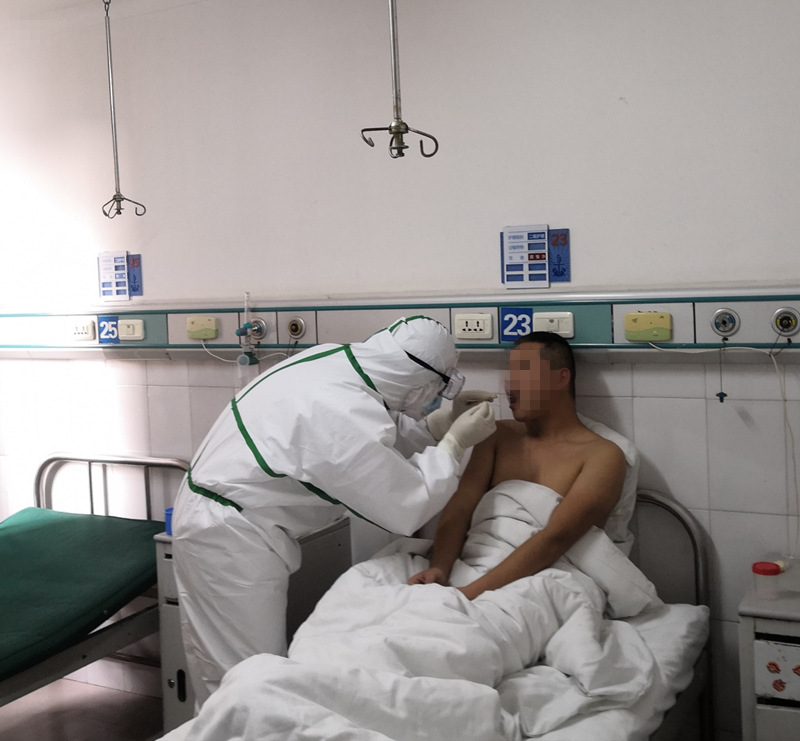 从年三十到年初八,冉献忠副主任就再也没有离开过隔离病房,因为临时组建的医疗团队,来自医院各科室,对于呼吸系统疾病并不擅长,冉献忠一边为大家讲解各项呼吸系统疾病和本次疫情的相关知识,一边身先士卒冲锋在一线。每一名疑似患者的咽拭纸采样,是感染风险最大的操作,在和患者身体接触的同时,还要受到飞沫传播的直接影响,冉献忠为了将同事感染的风险降到最低,每一名患者的采样都是由他亲自来完成,他说:我不放心让大家来进行这样的高危操作,再说,我做好示范,万一我倒下了,你们能通过我的操作知道该如何救我嘛。