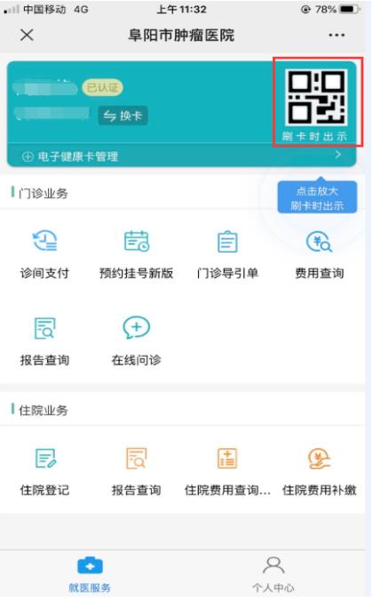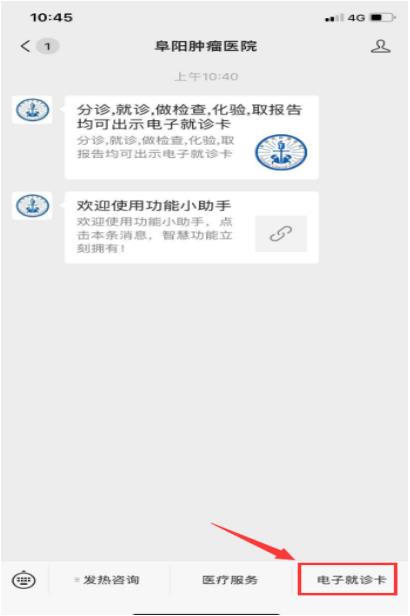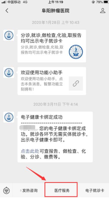 二、关注后,进入公众号首页,点击右下角“电子就诊卡”