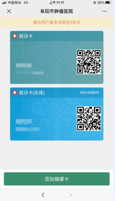 一个微信号可以绑定自己及家人最多五个人的就诊卡,便于多张就诊卡管理。具体操作流程如下: