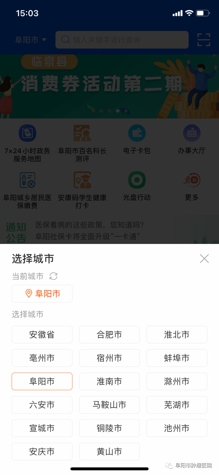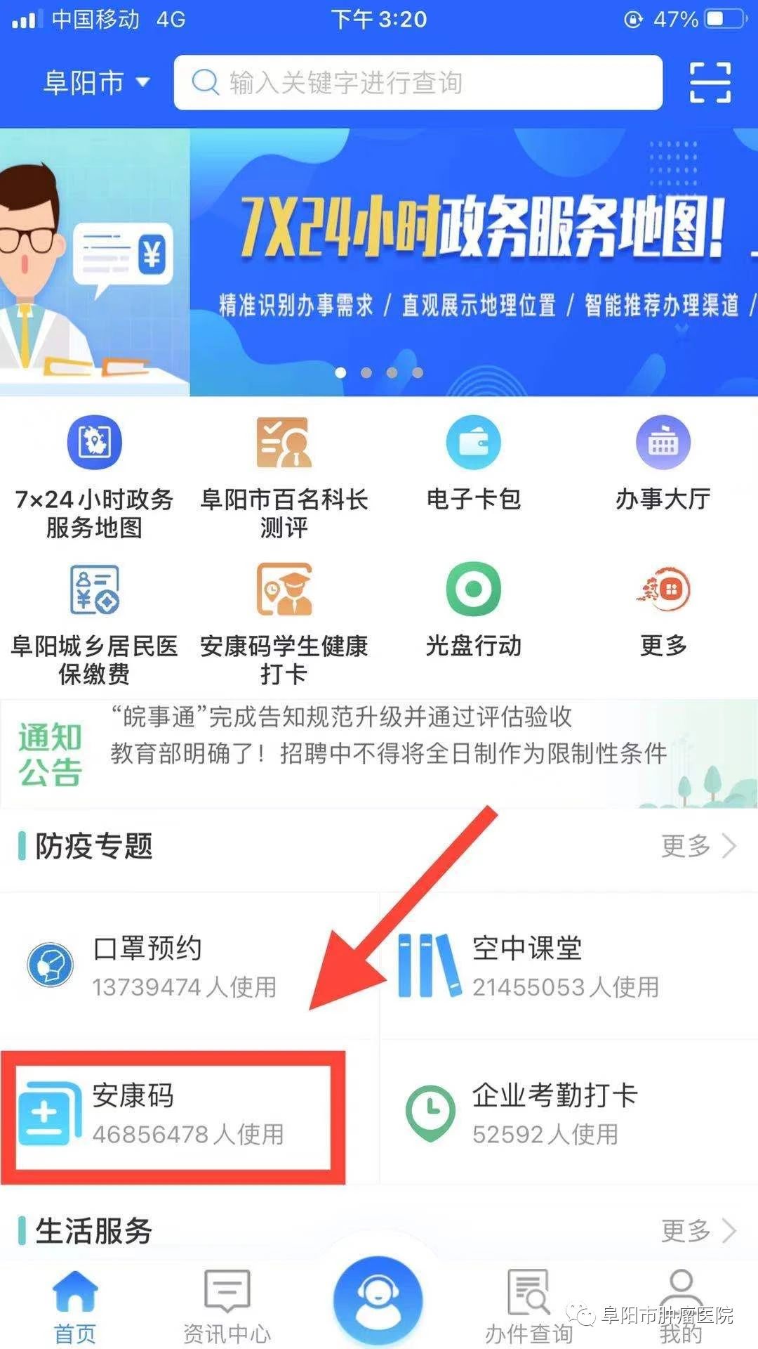 2、登录“皖事通”后,同意“自动定位”弹窗,或在主页面左上角手动选择阜阳;在首页直接点击“安康码”,或者搜索框直接搜索“安康码”。